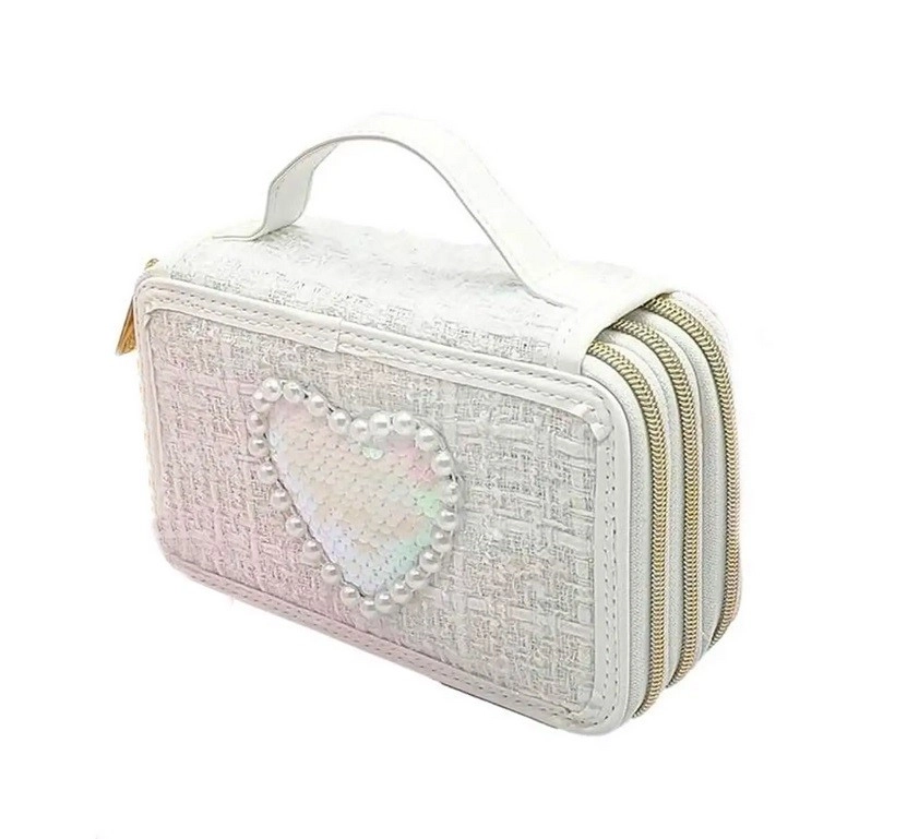 Stiloso astuccio Girabrilla in versione a tre livelli, progettato con tessuto tweed alla moda. Decorazione con perle bianche e cuoricino lucido donano un aspetto unico a qualsiasi scolara che ama combinare moda e praticità.