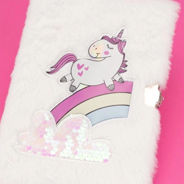 Il diario presenta una copertina pelosa extra morbida decorata con un unicorno iridescente e paillettes reversibili madreperlate. Questo design unico è ideale per chi ama accessori magici e colorati.