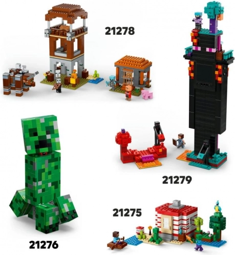 Il set include personaggi e mob iconici di MINECRAFT: Alex, il minatore, un ragno con posto per il cavaliere, uno scheletro arciere e un tenero orsetto polare. Dopo il gioco, il modello a forma di piccone diventa un pezzo da esposizione d’effetto per la cameretta.