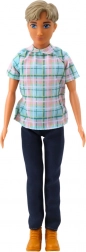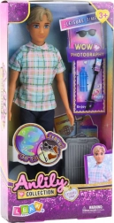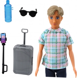 Bambola ragazzo Anlily è vestita con una camicia alla moda con motivi a quadri, pantaloni blu scuro e scarpe marroni. Sono disponibili accessori alla moda come una valigia grigia su ruote con manico estraibile, una asta per selfie con telefono, occhiali da sole e una bottiglia d'acqua.