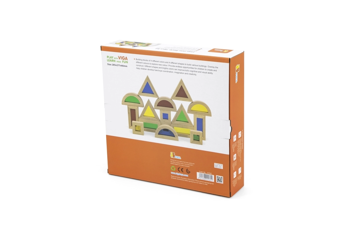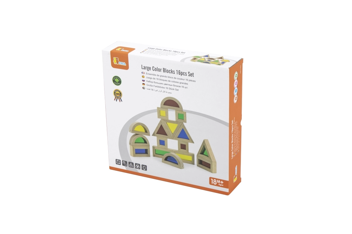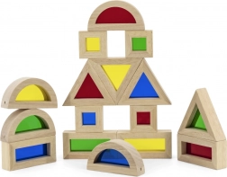 Questo set di 16 blocchi in legno finemente rifiniti con inserti trasparenti colorati offre infinite possibilità di costruzione, classificazione ed esplorazione della luce e dei colori. I bambini possono costruire torri, casette o ponti sviluppando al contempo percezione spaziale e pensiero logico.