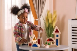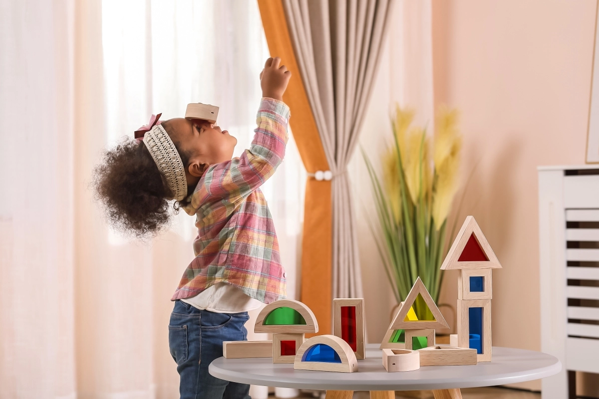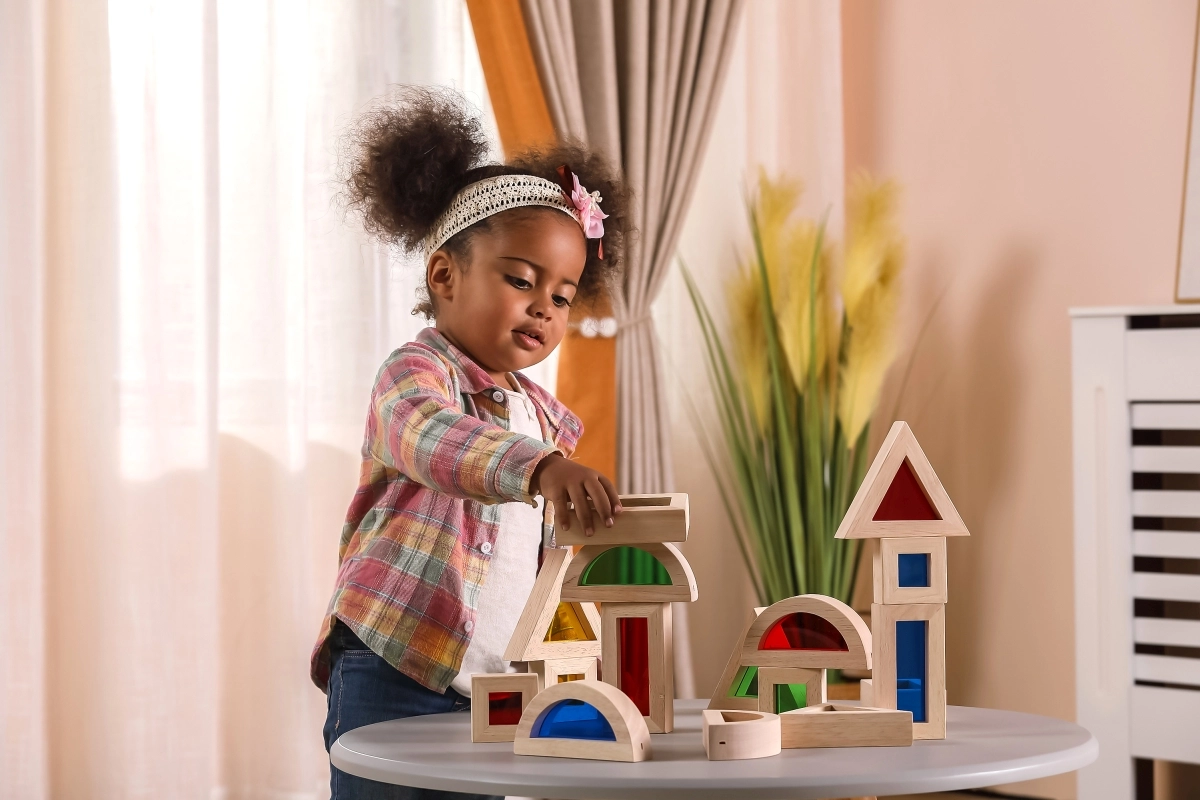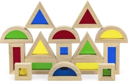 Triangoli, quadrati, rettangoli e semicerchi sviluppano la percezione spaziale e consentono costruzioni stabili durante la sovrapposizione e l’impilamento.