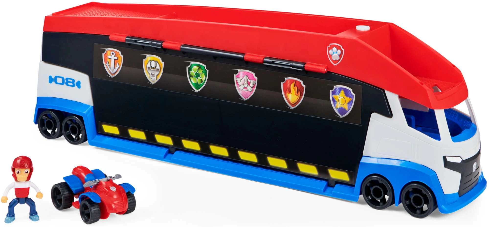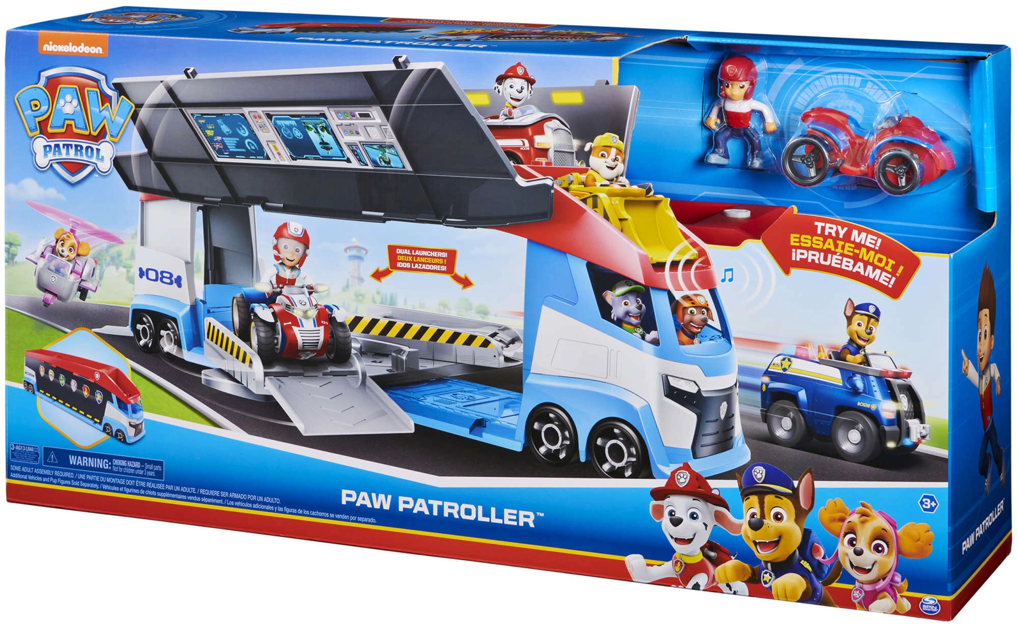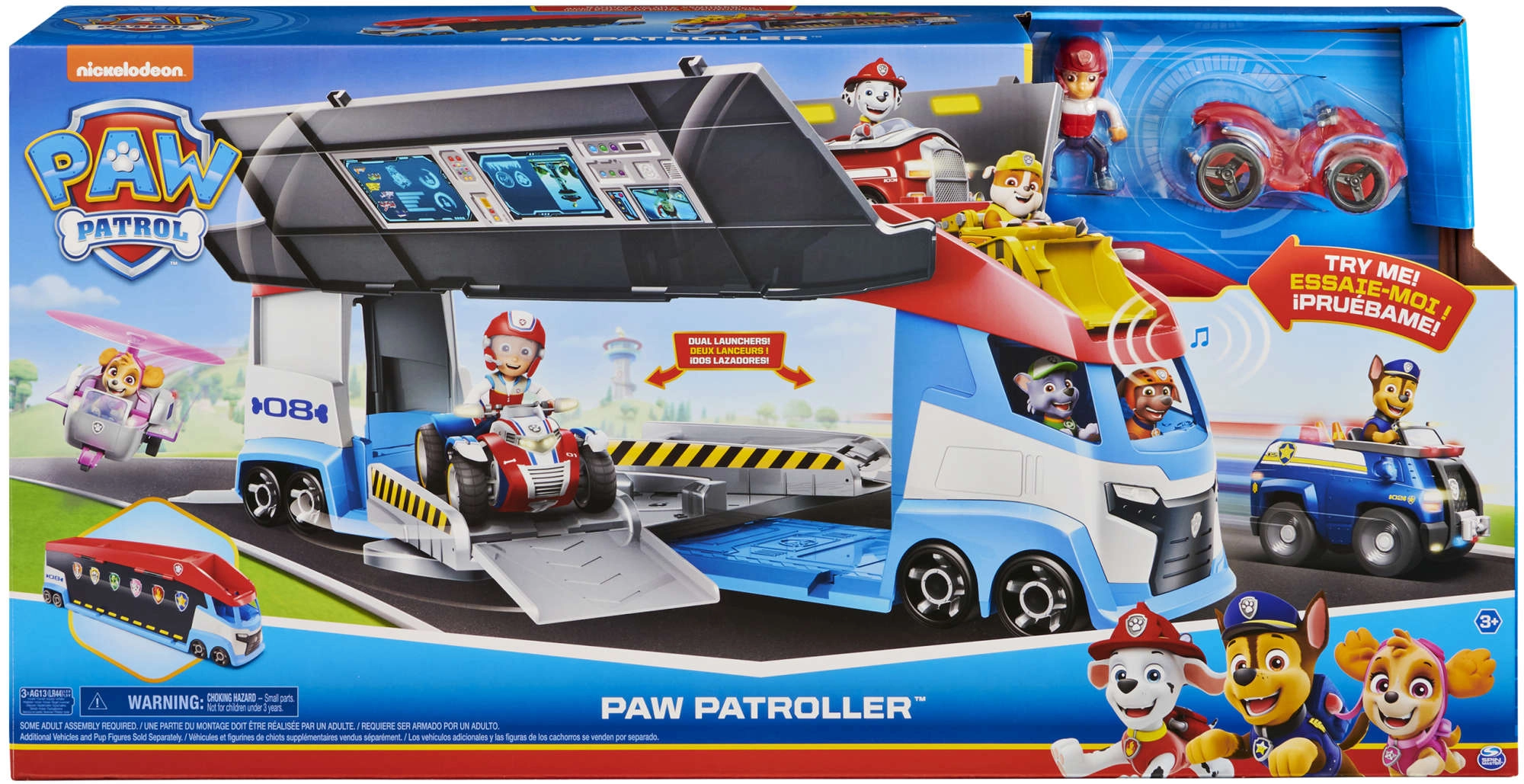Il Pattugliatore può trasportare fino a 6 veicoli (compatibile con le macchinine standard PAW PATROL), dispone di 2 catapulte per entrare in azione in un lampo e di porte laterali sollevabili per un accesso fluido. Con la mini-figura di Ryder e il suo quad inclusi, i bambini possono partire immediatamente per la missione.