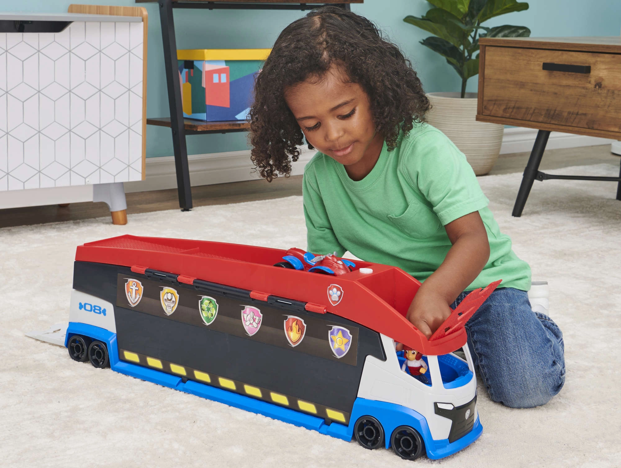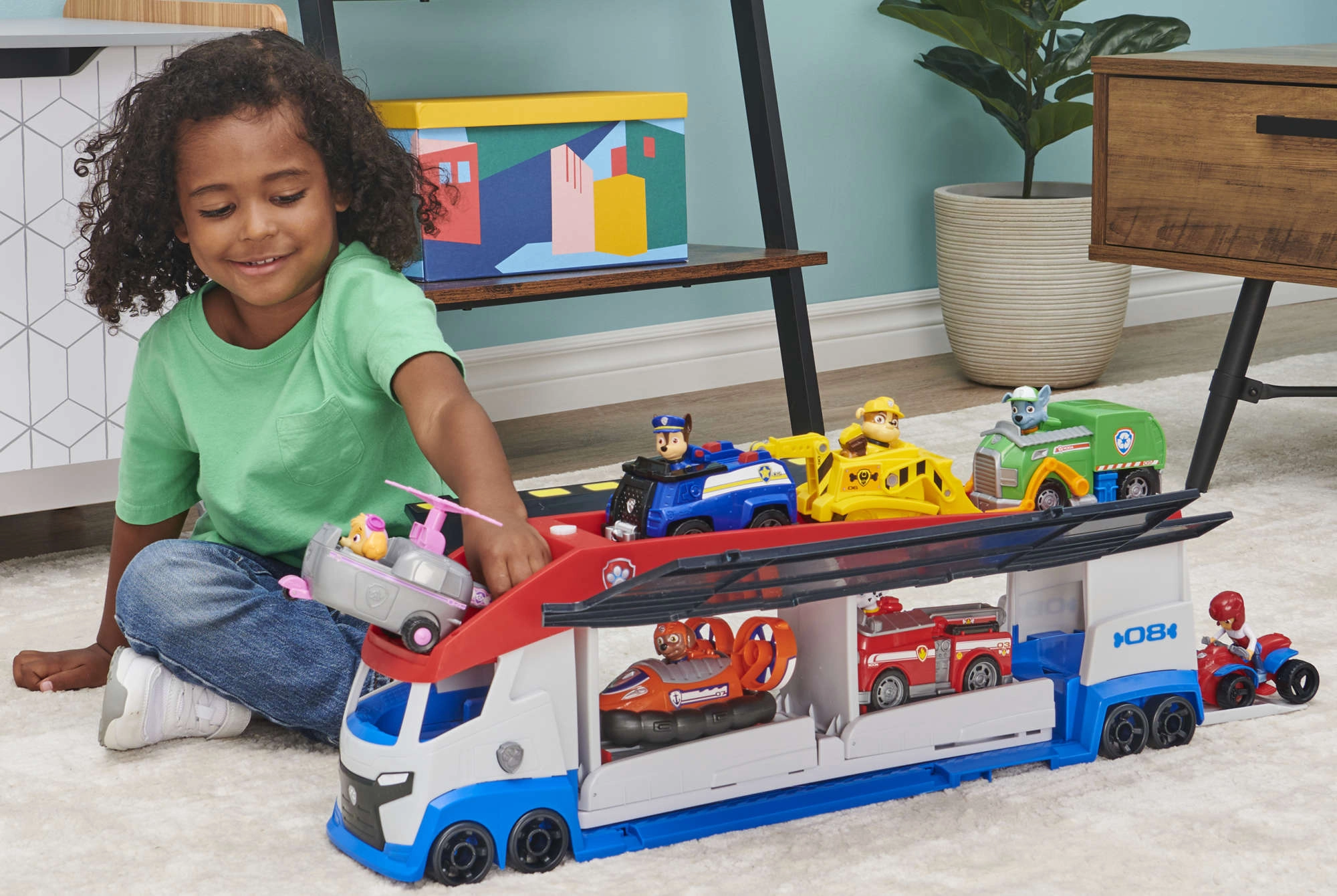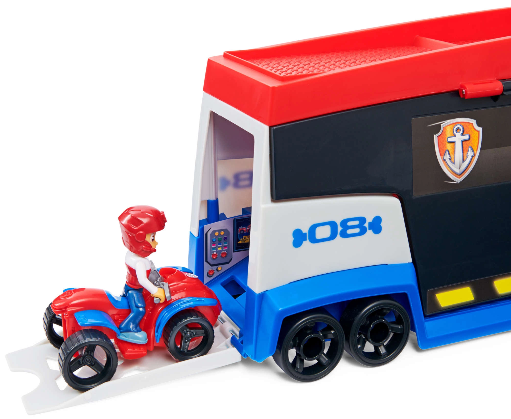 Il Pattugliatore può trasportare fino a 6 veicoli (compatibile con le macchinine standard PAW PATROL), dispone di 2 catapulte per entrare in azione in un lampo e di porte laterali sollevabili per un accesso fluido. Con la mini-figura di Ryder e il suo quad inclusi, i bambini possono partire immediatamente per la missione.