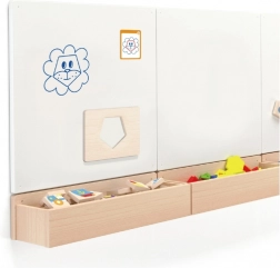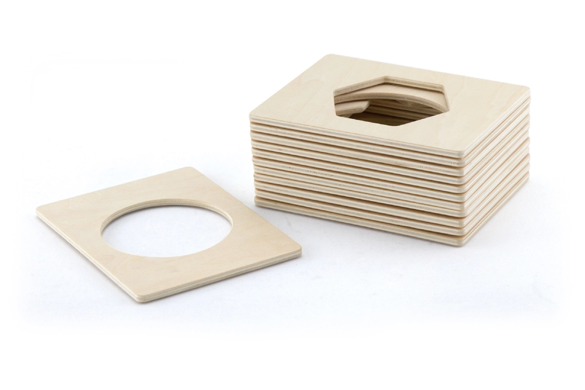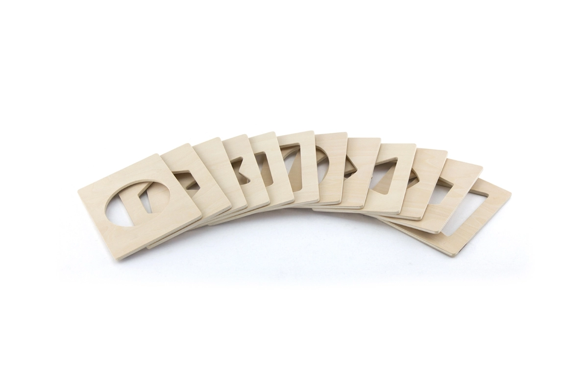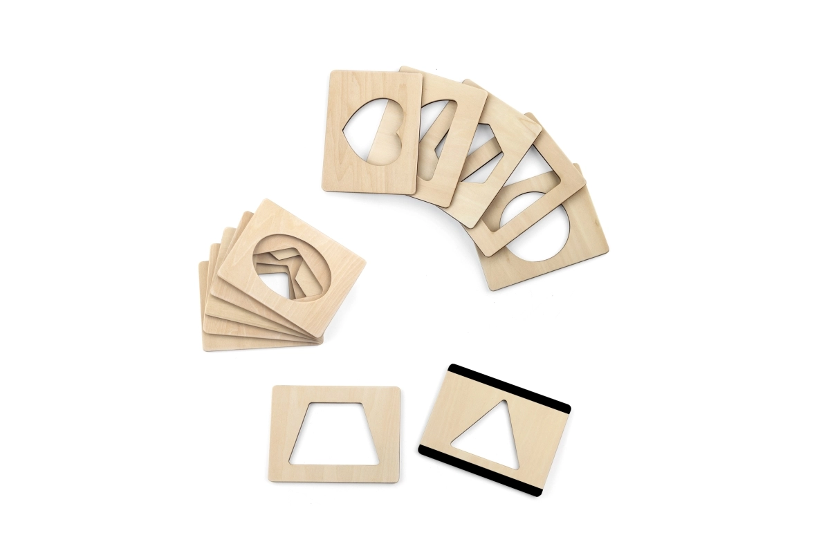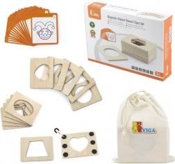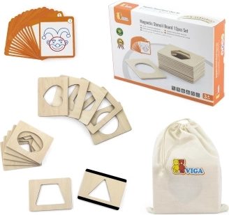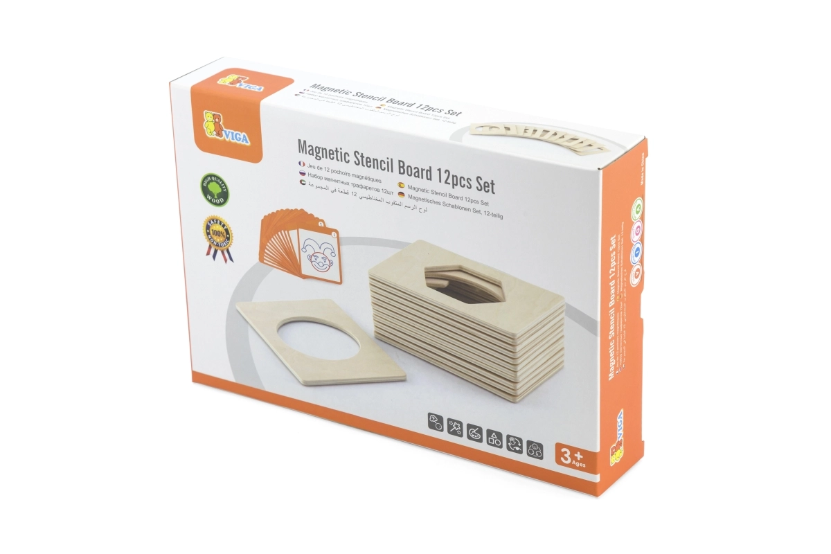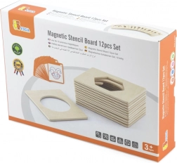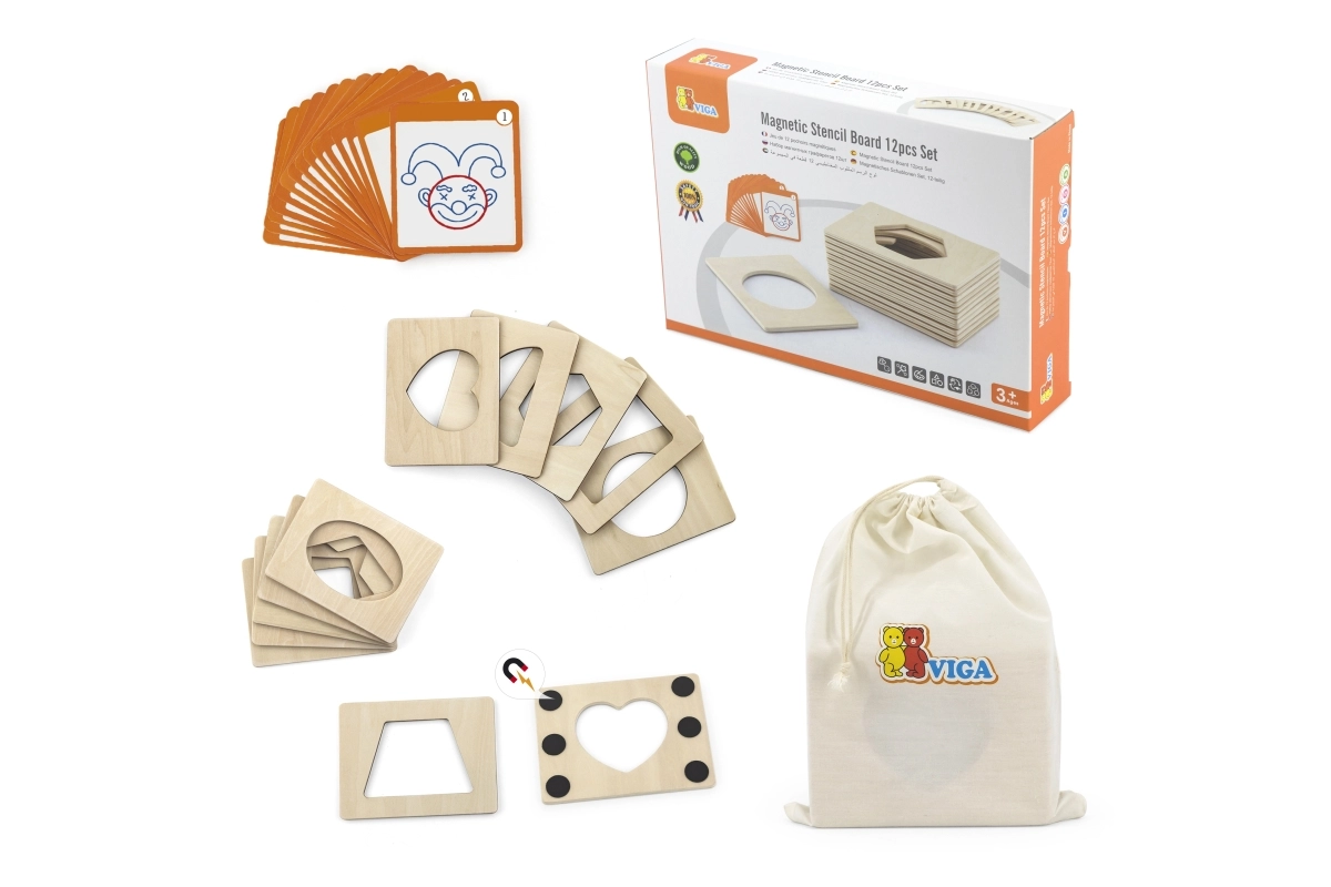 Questo set unico include 12 pezzi di modelli in legno, ideali per bambini dai 3 anni in su. Ogni modello ha un fondo magnetico che facilita la manipolazione e assicura che rimanga al suo posto.