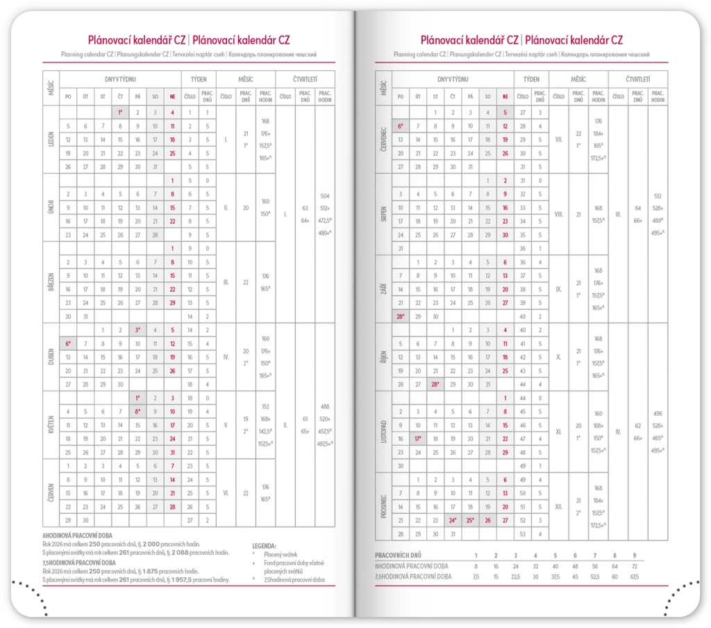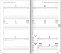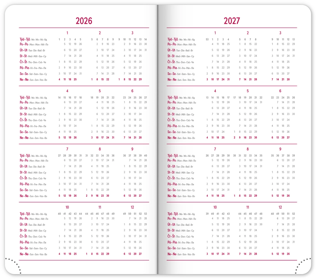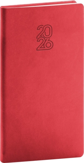 Il diario tascabile rosso per l'anno 2026, in un design elegante, offre un programma settimanale con un calendario ceco-slovacco e lingue aggiuntive. Il nuovo rilievo dell'anno e i colori comprovati assicurano stile e chiarezza.