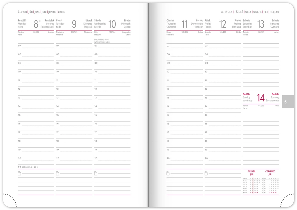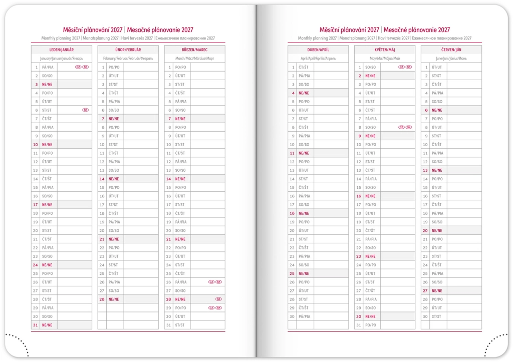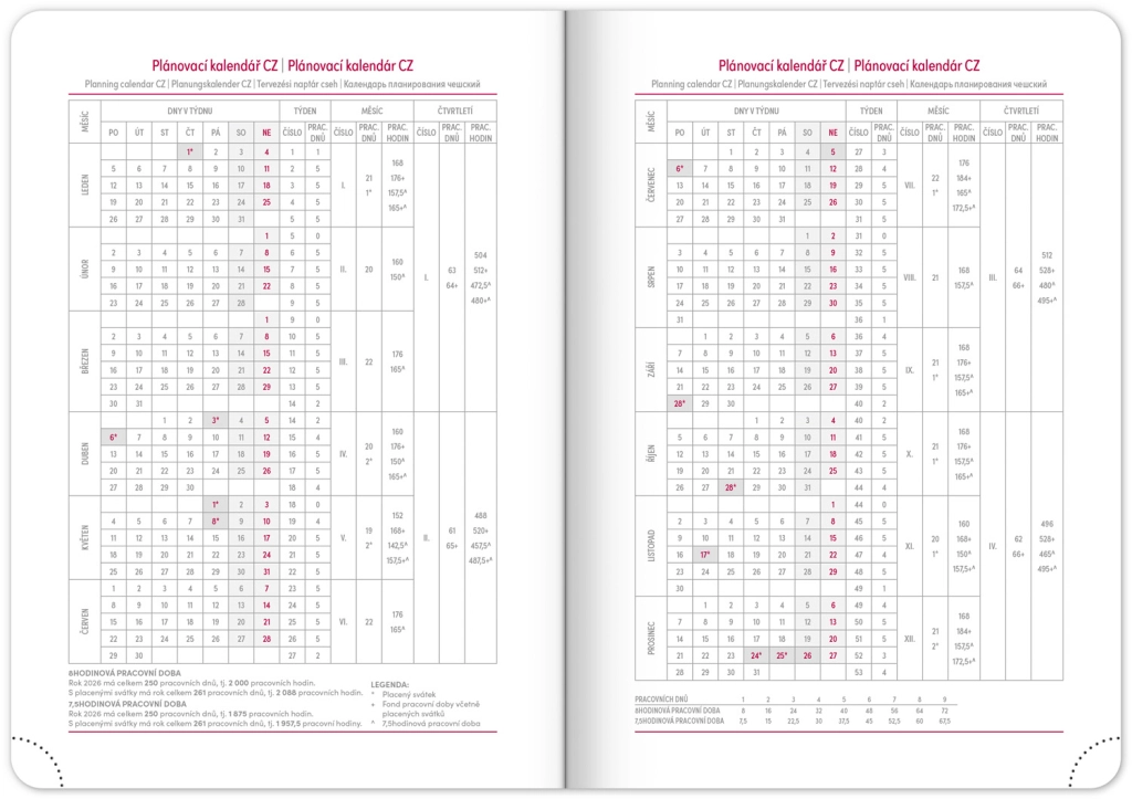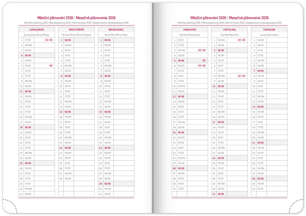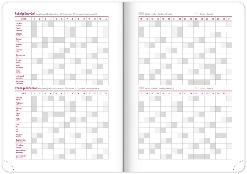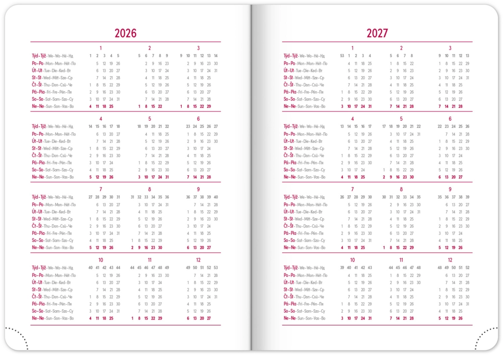Elegante agenda settimanale Ajax 2026 color oro con superficie finemente strutturata e rilievo atipico è il compagno ideale per ogni giorno. Grazie al calendario ceco-slovacco e alle sezioni aggiuntive in inglese, tedesco, ungherese e russo, è pratico e adattabile per tutti.