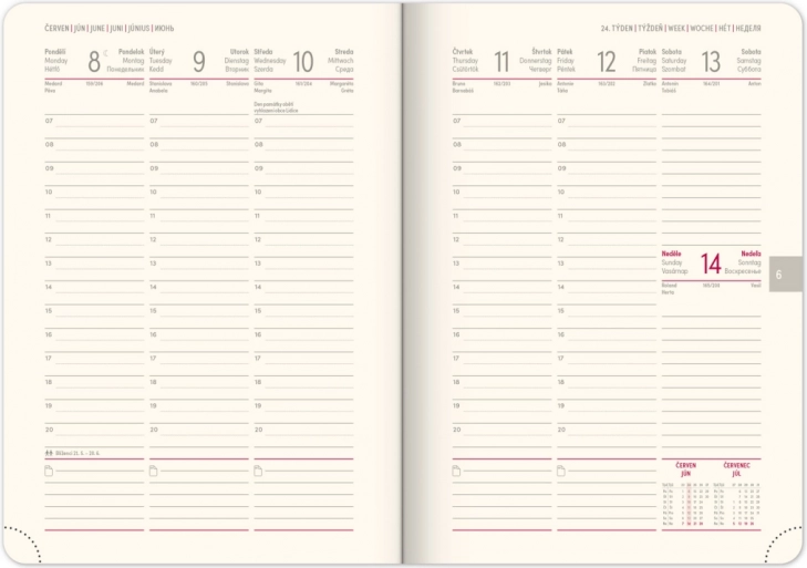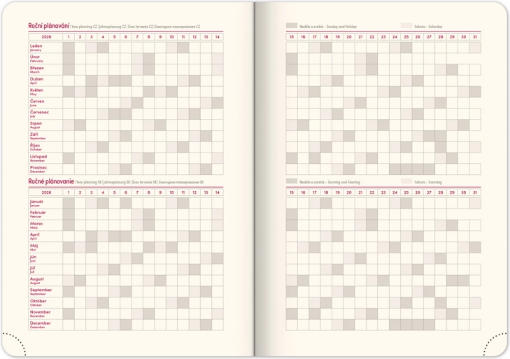 Questa agenda settimanale combina stile e funzionalità grazie al design blu-oro con superficie metallica e rilievo dell'anno. Ha caratteristiche pratiche come angoli arrotondati, portapenne e banda elastica per un uso comodo. Il diario include una pianificazione con calendario ceco-slovacco e altre lingue come inglese, tedesco, ungherese e russo.