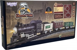 locomotiva con luce e suoni, carrozza passeggeri, carro per il carbone, carro merci, 10 pezzi di binario (4 dritti, 6 curvi)