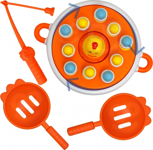 La canna magnetica facilita la pesca e il pulcino più grande, rimovibile, funge da divertente macchinina per ulteriori scenari di gioco.