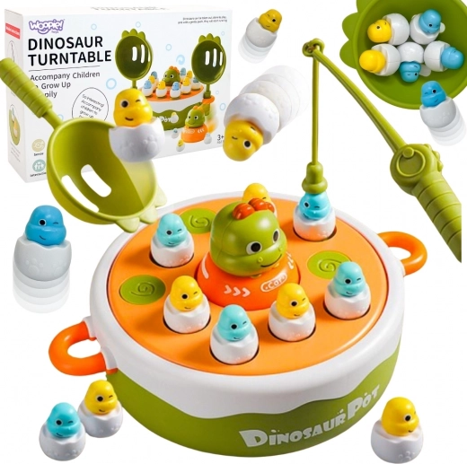 - Piattaforma girevole bifacciale con maniglie, figurine di dinosauri in “ovetti”, 1× canna magnetica, 2× palette, dinosauro–macchinina, confezione regalo