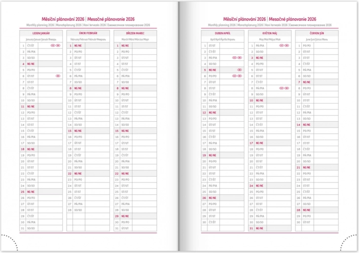 L'agenda settimanale Tomy 2026 è il compagno ideale per pianificare le tue giornate. Questa elegante agenda di colore marrone-rosso offre un pratico e chiaro piano settimanale con supporto per il calendario ceco-slovacco e lingue aggiuntive.