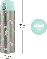 Goditi stile e praticità con questa termos che offre un'apertura semplice e beccuccio in silicone integrato. Con una capacità di 450 ml, è perfetta per l'uso quotidiano. La bottiglia è disponibile in vari design giocosi, facili da abbinare con altri accessori scolastici.