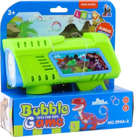 Pistola ad acqua e bolle di sapone dinosauro verde con LED, un ottimo giocattolo per bambini per giochi all'aperto e feste.