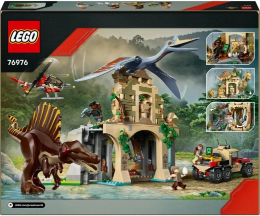Vivi un'azione nella giungla ispirata ai film: l'antico tempio con cascata nasconde un nido con uova, passaggi segreti e una trappola azionata da catena. Il Spinosauro snodabile (gambe, arti, coda, testa e mascella) e il maestoso Quetzalcoatlus (ali e mascella mobili) aggiungono scene realistiche di inseguimento e salvataggio.
