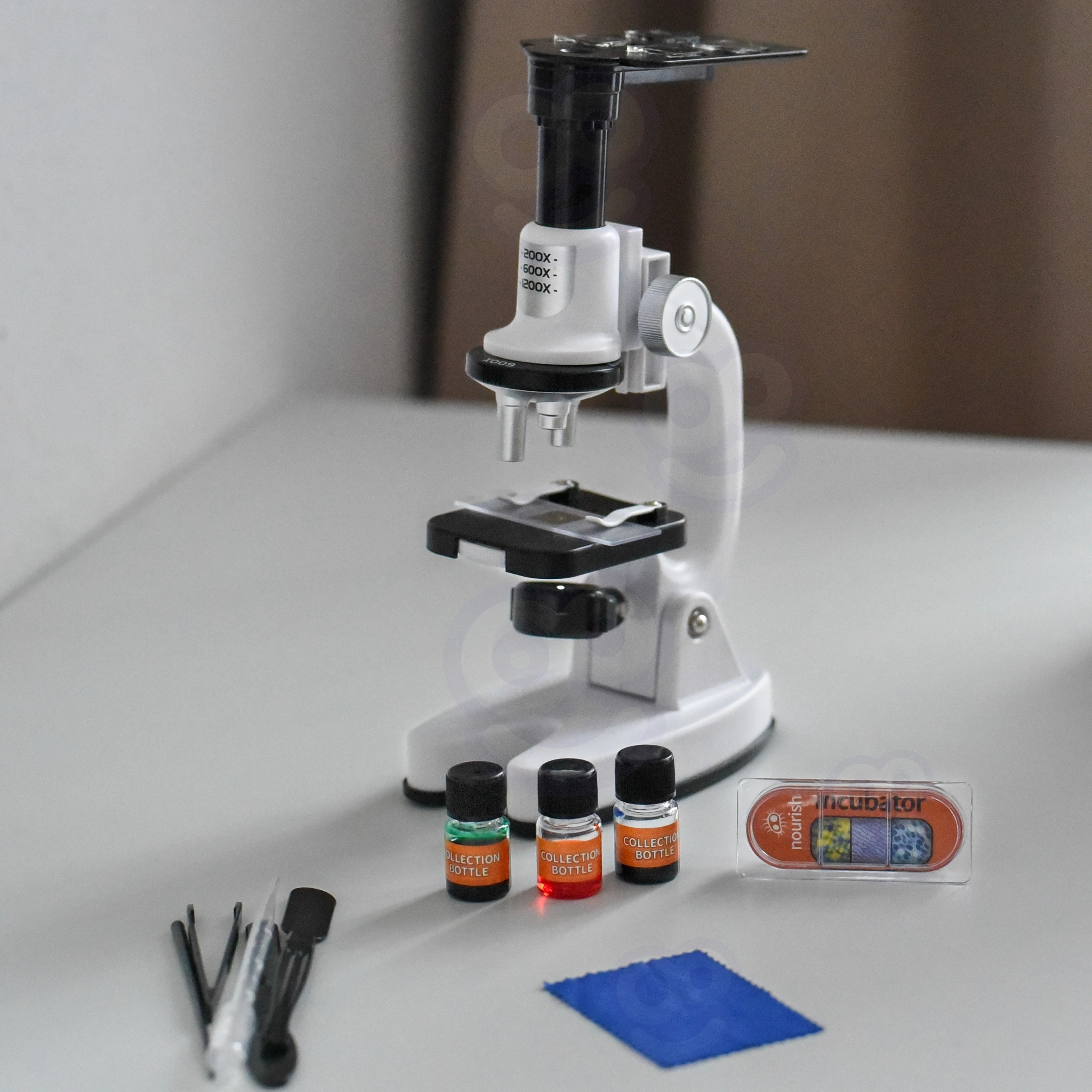 Vetrini, coprivetrini, boccette, pinzetta, pipetta, utensili e contenitori – tutto ciò di cui i bambini hanno bisogno per preparare e osservare i campioni.