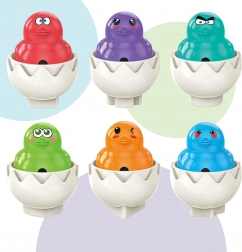 Uova da gioco del marchio Woopie introducono il tuo bambino in un mondo pieno di colori, forme e faccine allegre. Ognuno dei sei adorabili ovetti nasconde un pulcino colorato con un'espressione buffa e, se premuto, emette un effetto sonoro. L'obiettivo non è solo assemblare il guscio giusto, ma anche posizionarlo nel posto giusto nel contenitore.