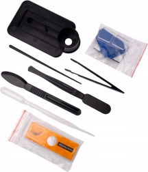 - Il set include: strumenti per la preparazione dei campioni, vetrini di base, flaconi per la conservazione dei campioni, panno per la pulizia e supporto per telefono.