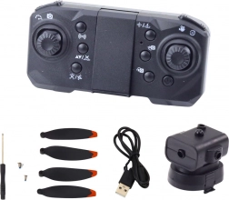 - Drone D6 Pro, radiocomando, modulo fotocamera aggiuntivo, batteria, cavo USB, 4 eliche di ricambio, 4 protezioni eliche, cacciavite, custodia per il trasporto