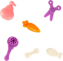L'equipaggiamento del set comprende accessori da parrucchiere giocattolo e cibo giocattolo, come ciotole, prosciutto, osso, pesce e carota. Tutte le parti sono realizzate in plastica sicura e destinate ai bambini sopra i tre anni.