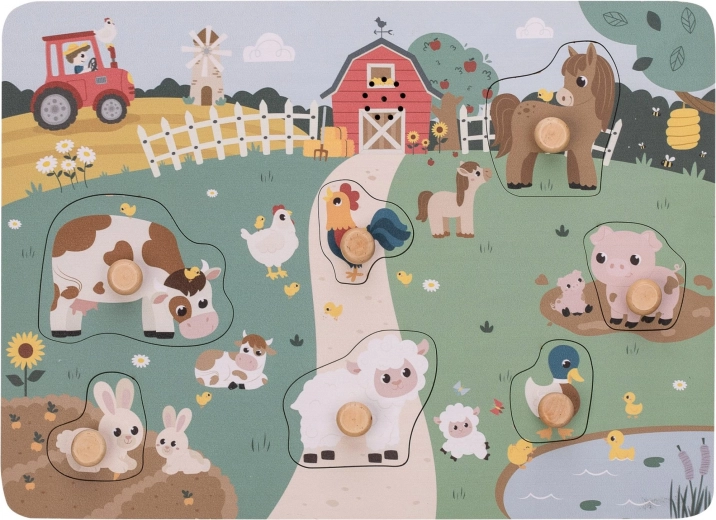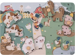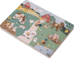 Puzzle sonoro in legno con tema degli animali della fattoria, che emettono i loro caratteristici suoni quando sono inseriti nell'apposito spazio. Divertimento perfetto per bambini che sviluppano la loro immaginazione e le loro abilità motorie.