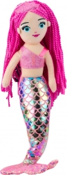 La sirena di peluche è dotata di una coda olografica decorativa che ricorda le scaglie, scintillante alla luce, e richiama il magico mondo sottomarino. Ha anche lunghi capelli rosa in forma di trecce che possono essere pettinati e acconciati, un top scintillante a una spalla e una tiara rosa sulla testa.