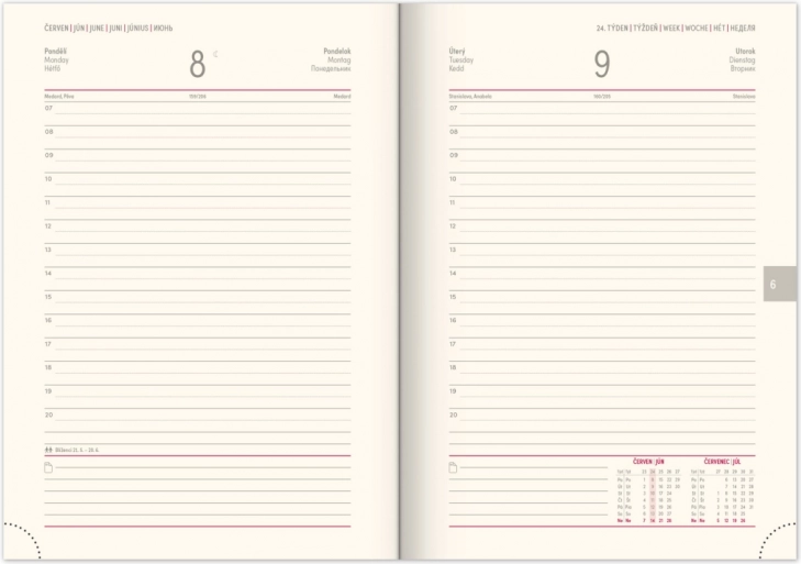 Stiloso e sostenibile diario quotidiano Essenza 2026 con copertina in carta ecologica offre una perfetta combinazione di praticità ed eleganza. Contiene il layout con calendario ceco-slovacco e lingue supplementari come inglese, tedesco, ungherese e russo.