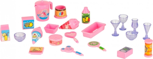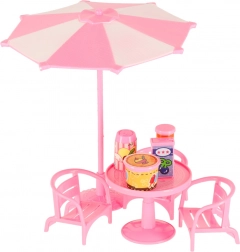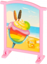 Incluso un ricco set di accessori: tavolini, seggioline, ombrellone, cartello pubblicitario e tanti piccoli complementi come bicchierini, coppette, gelati, piccola teiera e vassoio. La struttura in plastica leggera e resistente è perfetta per il gioco quotidiano a casa e in viaggio.