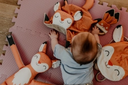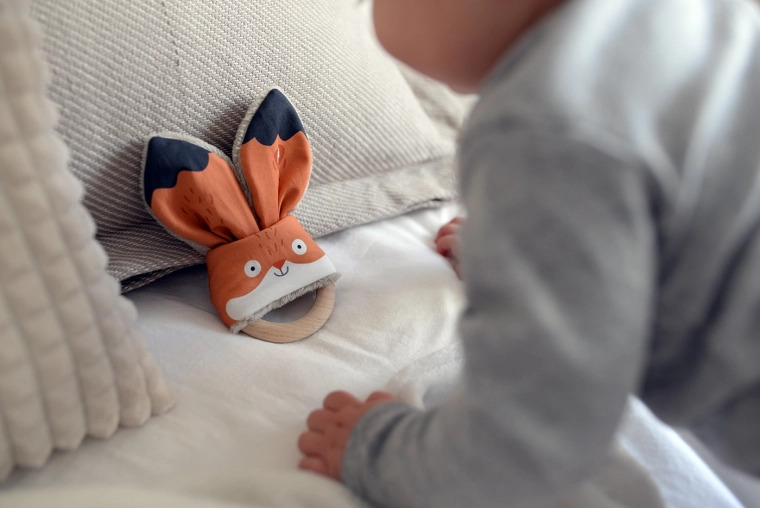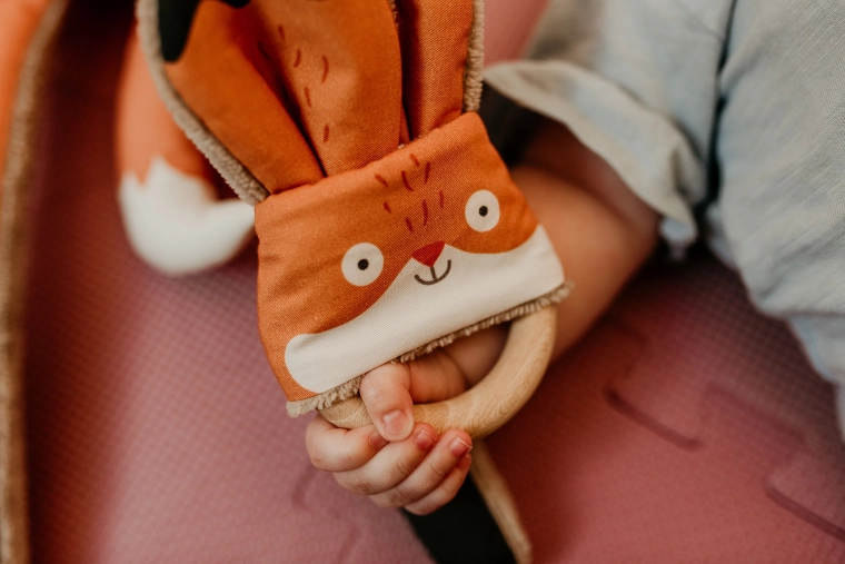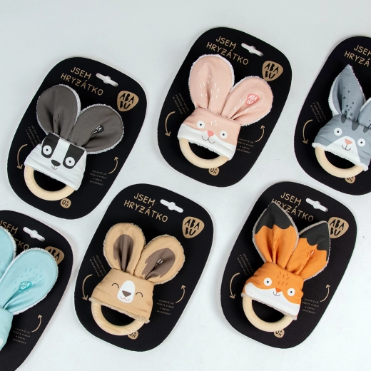 Il giocattolo Morso di Volpe di Ababu combina design originale e sicurezza per i più piccoli. I materiali rivestiti con stampa d'autore sono 100% cotone, con certificazione per bambini fino a 3 anni. L'anello è di legno di faggio naturale, realizzato a mano nella Vysočina.