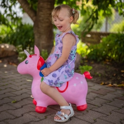 L’unicorno saltellante rosa Woopie è il compagno perfetto per il gioco attivo in casa e all’aperto. Grazie alle comode impugnature a forma di orecchie e alle ampie zampette antiscivolo, la guida è stabile e sicura. La criniera colorata, il corno bianco e il motivo a stelline stimolano la fantasia dei bambini e trasformano ogni momento in una divertente avventura.