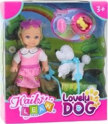 Mini bambola con cagnolino al guinzaglio e ciotola con osso
