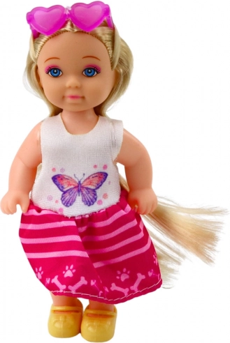 Questo adorabile set trasporta i bambini nel mondo della cura premurosa e del divertimento giocoso con gli animali domestici. La bambola alta 12 cm è vestita con un abito colorato: maglietta bianca con stampa di farfalle, gonna rosa con motivo di zampette e scarpe gialle. La bambola indossa occhiali rosa a forma di cuore, che le conferiscono un carattere distintivo.