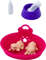 I bambini possono divertirsi con due piccoli cagnolini da nutrire, accudire e adagiare nel lettino rosa con il motivo della zampa. Grazie al biberon per alimentazione e alla ciotola viola con l'osso, i bambini possono giocare scene realistiche di cura, sviluppando empatia, creatività e abilità manuali.