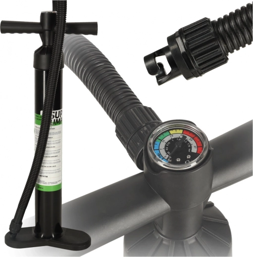 Pompa ad alta pressione per SUP è uno strumento indispensabile per un rapido ed efficace gonfiaggio non solo delle tavole SUP, ma anche di altri prodotti gonfiabili. Grazie al manometro integrato puoi controllare esattamente la pressione per un gonfiaggio ottimale dell'attrezzatura. La pompa è dotata di piedini stabili, che garantiscono stabilità durante il pompaggio, e un manico a T che offre una presa comoda e sicura, fondamentale per un lavoro confortevole. Con questa pompa preparerai rapidamente la tavola all'acqua e godrai di ogni avventura!