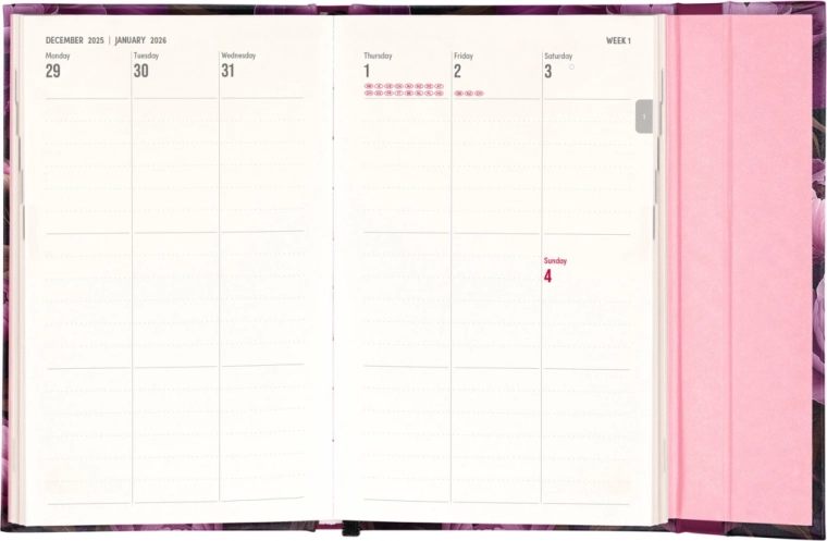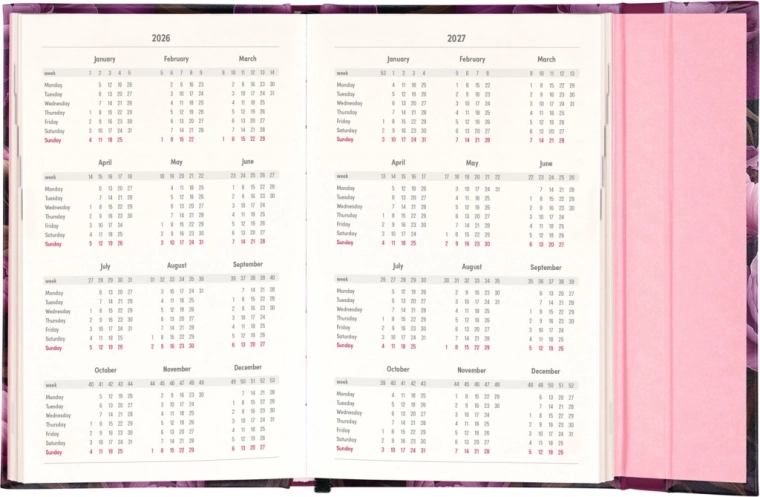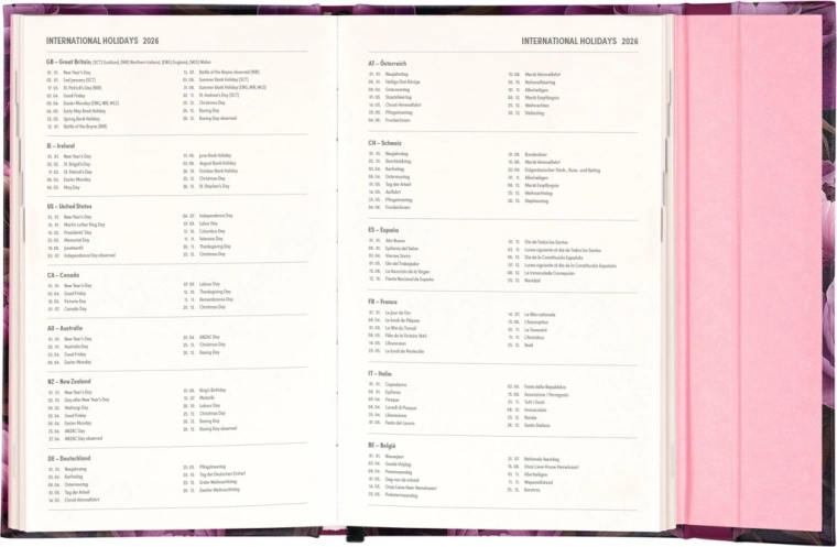 Include anche panoramiche mensili, ideali per pianificare vacanze o ferie. L'agenda non è solo pratica, ma grazie al design con motivo di fiori viola è anche un complemento di stile per la tua scrivania.