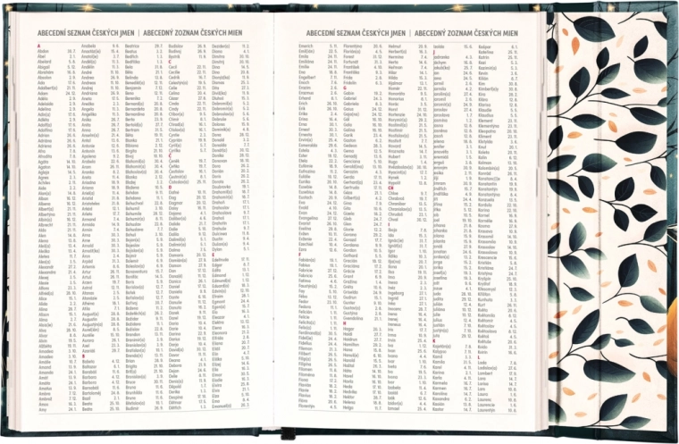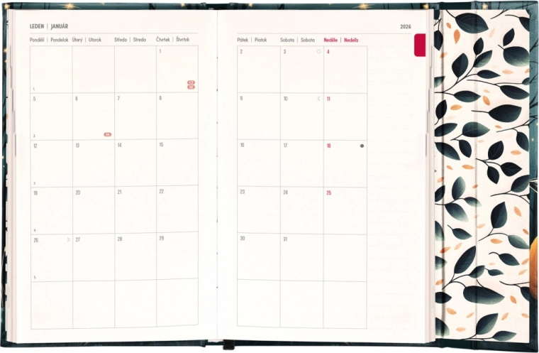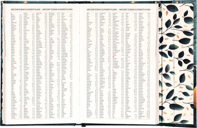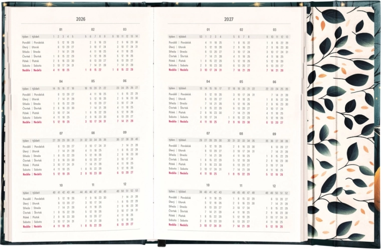 È dotata di panoramiche mensili che facilitano la pianificazione di periodi più lunghi come vacanze o ferie scolastiche. Quest'agenda include anche un elenco di festività e nomi cechi e slovacchi, consentendo una migliore organizzazione del tempo libero.