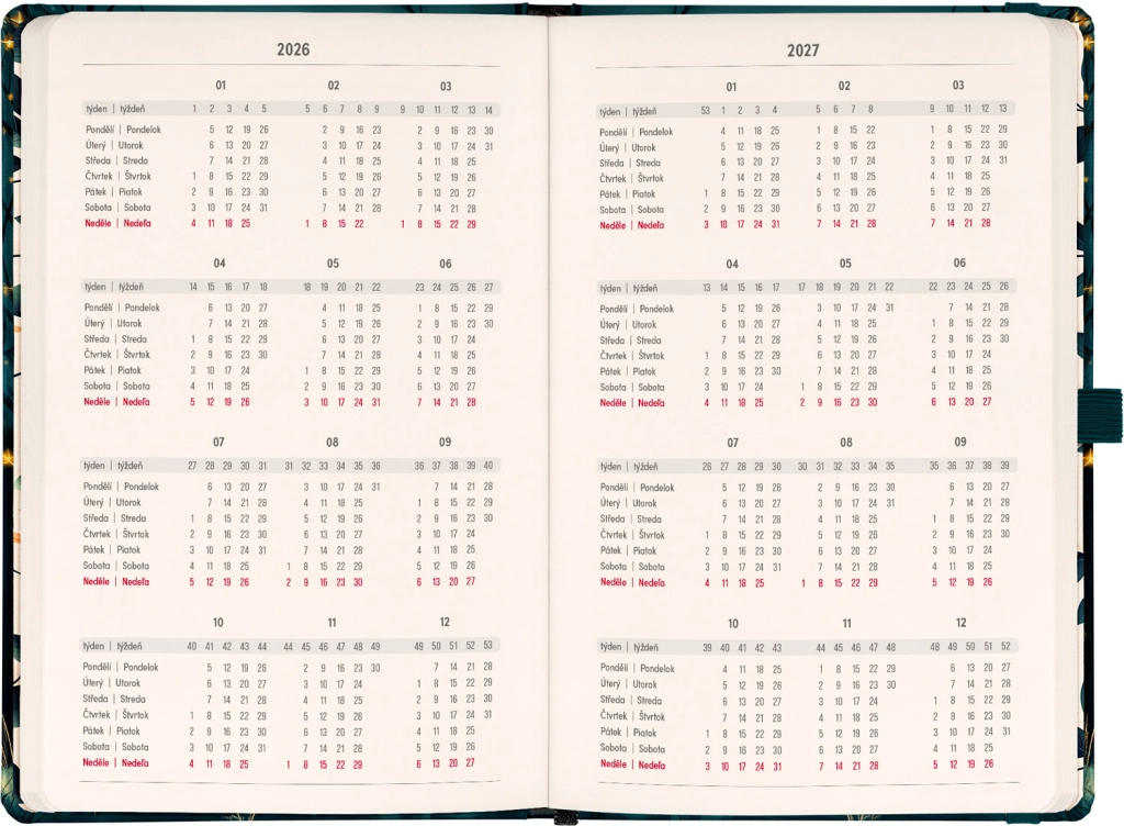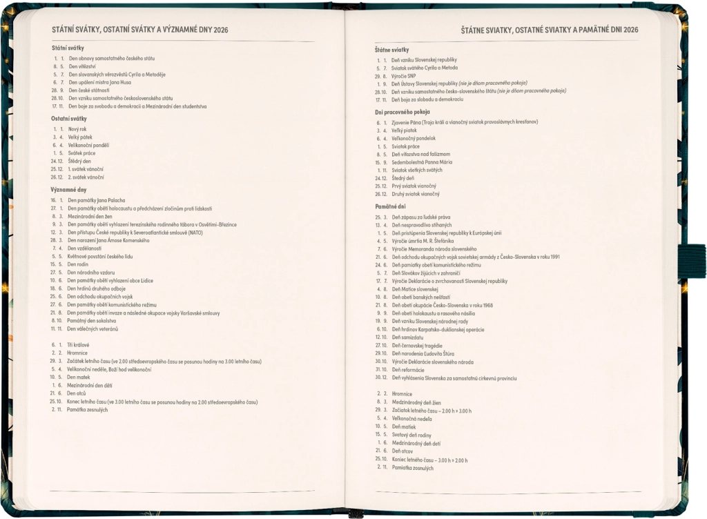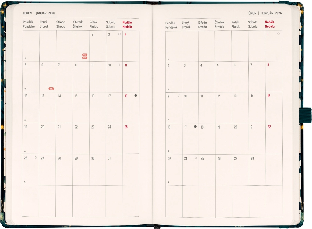 Goditi la fusione ideale di agenda e taccuino con PLANBOOK. La prima metà contiene un calendario orizzontale quindicinale con festività ceche e slovacche, che ti aiuta a pianificare ogni giorno con cura. La seconda metà composta da pagine a righe è perfetta per annotare tutte le tue note, idee o progetti.