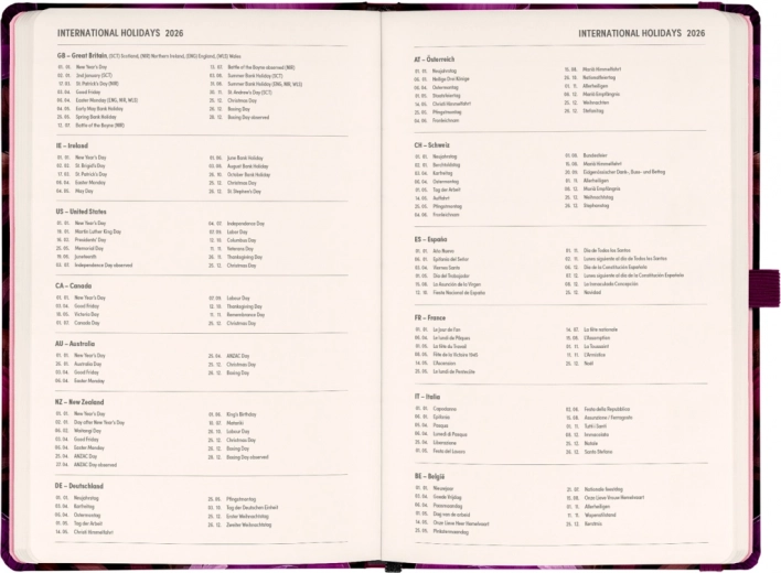 - La metà con un calendario orizzontale quindicinale include anche le festività internazionali.