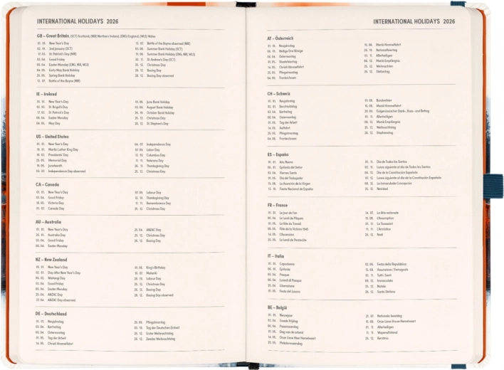 - Parte agenda: Calendario orizzontale a quindici giorni con festività internazionali.