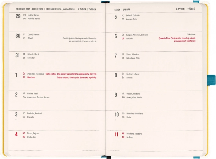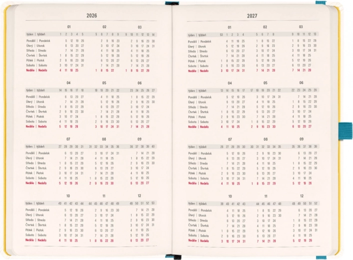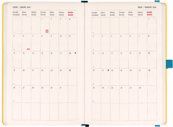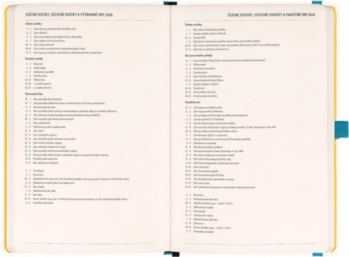 AGENDA Herbàrio 2026 è la soluzione ideale per chi desidera avere pianificazione e note in un unico luogo. La prima metà contiene un calendario quattordicinale orizzontale con festività ceche e slovacche, facilitando la pianificazione. La seconda metà offre un'ampia quantità di pagine a righe per le note, perfetta per pensieri creativi e progettazione.