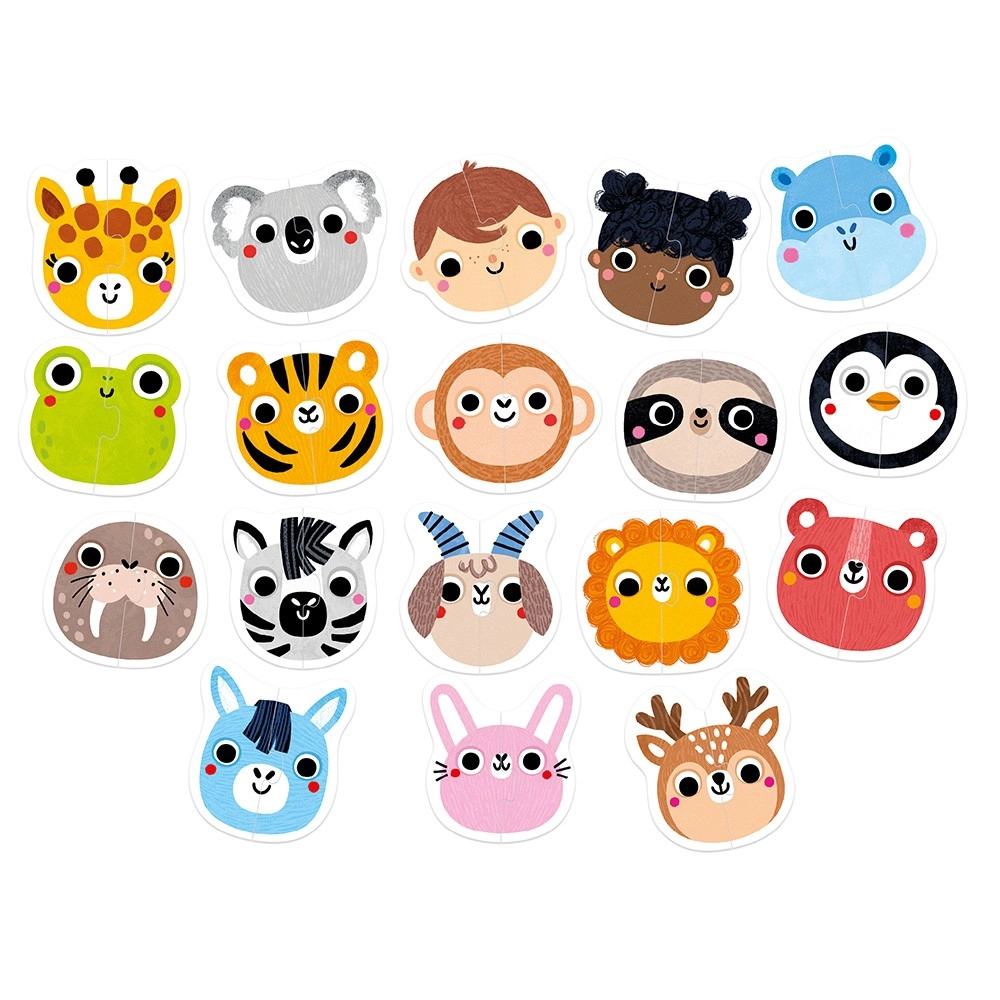 Cosa trovi nella scatola? Fino a 18 puzzle a due pezzi con volti di animali e 2 volti di bambini, offrendo ai tuoi piccoli molte possibilità di gioco divertente!