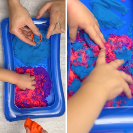 La sabbia cinetica è morbida al tatto, mantiene perfettamente la forma, non si attacca alle mani e non si secca – ideale per ore di gioco.