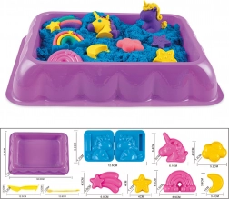 - sabbia cinetica, tavolino/vassoio in plastica, set di formine (unicorni, arcobaleni, stelle, nuvolette ecc.), strumenti per modellare