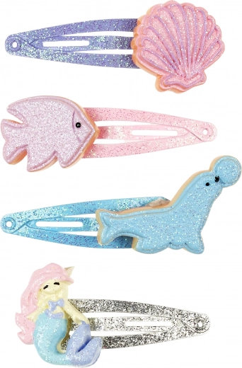 Set di quattro fermagli per capelli scintillanti con motivi da favola di sirene, foche, pesci e conchiglie, che donano alla pettinatura un tocco magico.
