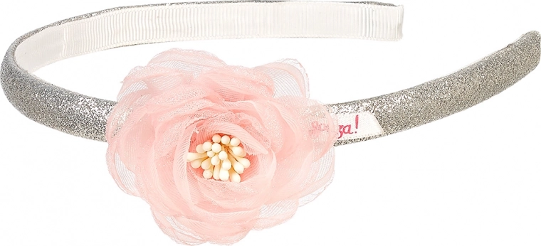 Cerchietto argentato scintillante per piccole principesse dai 3 anni in su, decorato con un bel fiore rosa in tulle. Leggero e confortevole sulla testa senza pressione.