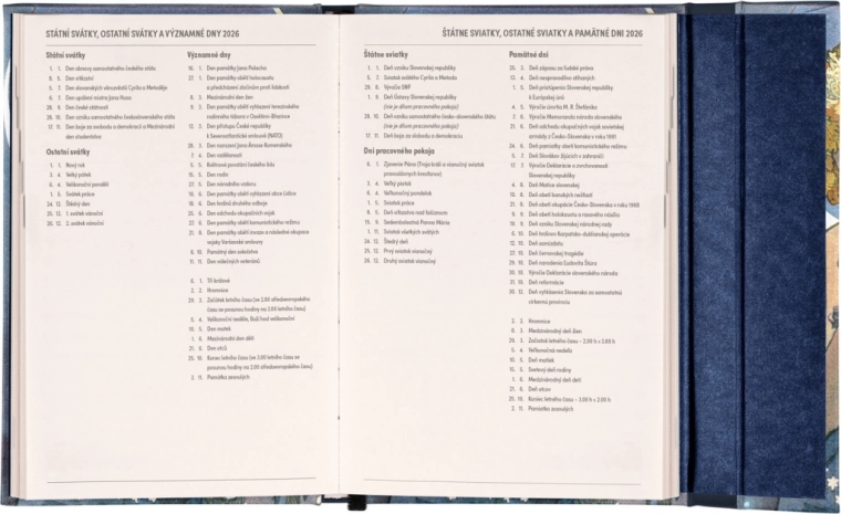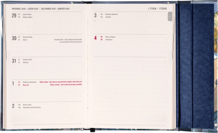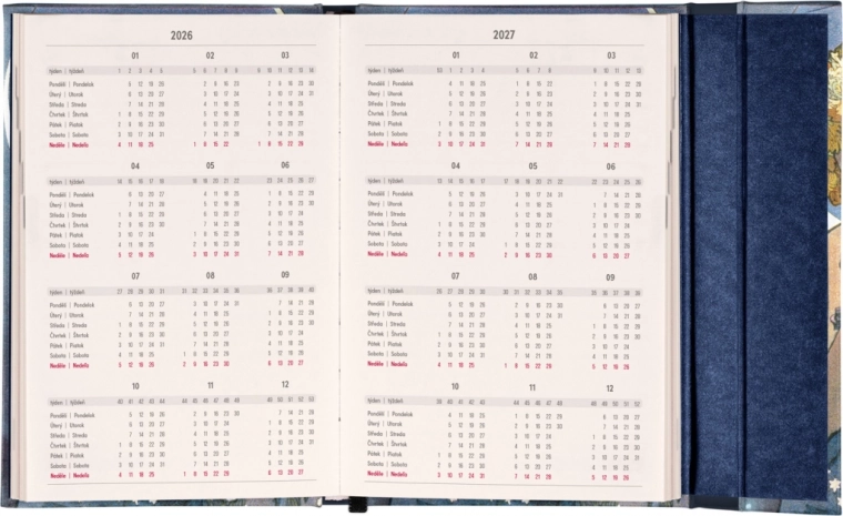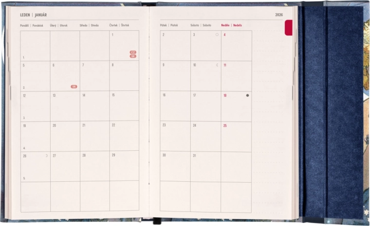 Questa agenda dal design attraente presenta una disposizione orizzontale con calendario ceco e slovacco per due settimane, garantendo spazio per una registrazione dettagliata dei tuoi piani.