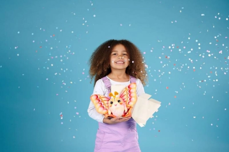 La farfalla di peluche Fluffyfly è la compagna ideale per coccole e gioco. Il suo corpicino soffice e le grandi ali colorate con gonfiaggio rapido garantiscono un effetto “wow” all’apertura della confezione: le ali si dispiegano magnificamente e la farfalla brilla subito di colori.
