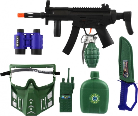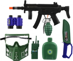 Preparatevi all'avventura con questo set militare, che comprende una mitragliatrice di plastica a scatto e accessori a tema, ideali per sviluppare l'immaginazione e il gioco di movimento.