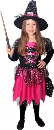 Costume magico di carnevale per piccole streghe! Il costume nero-rosa è ideale per bambine di età compresa tra 6-8 anni, altezza 117-128 cm. Si distingue per i nastri rosa e le stelle argentate.