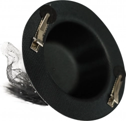 • è decorato con nastro nero, piume e tulle per un aspetto sofisticato